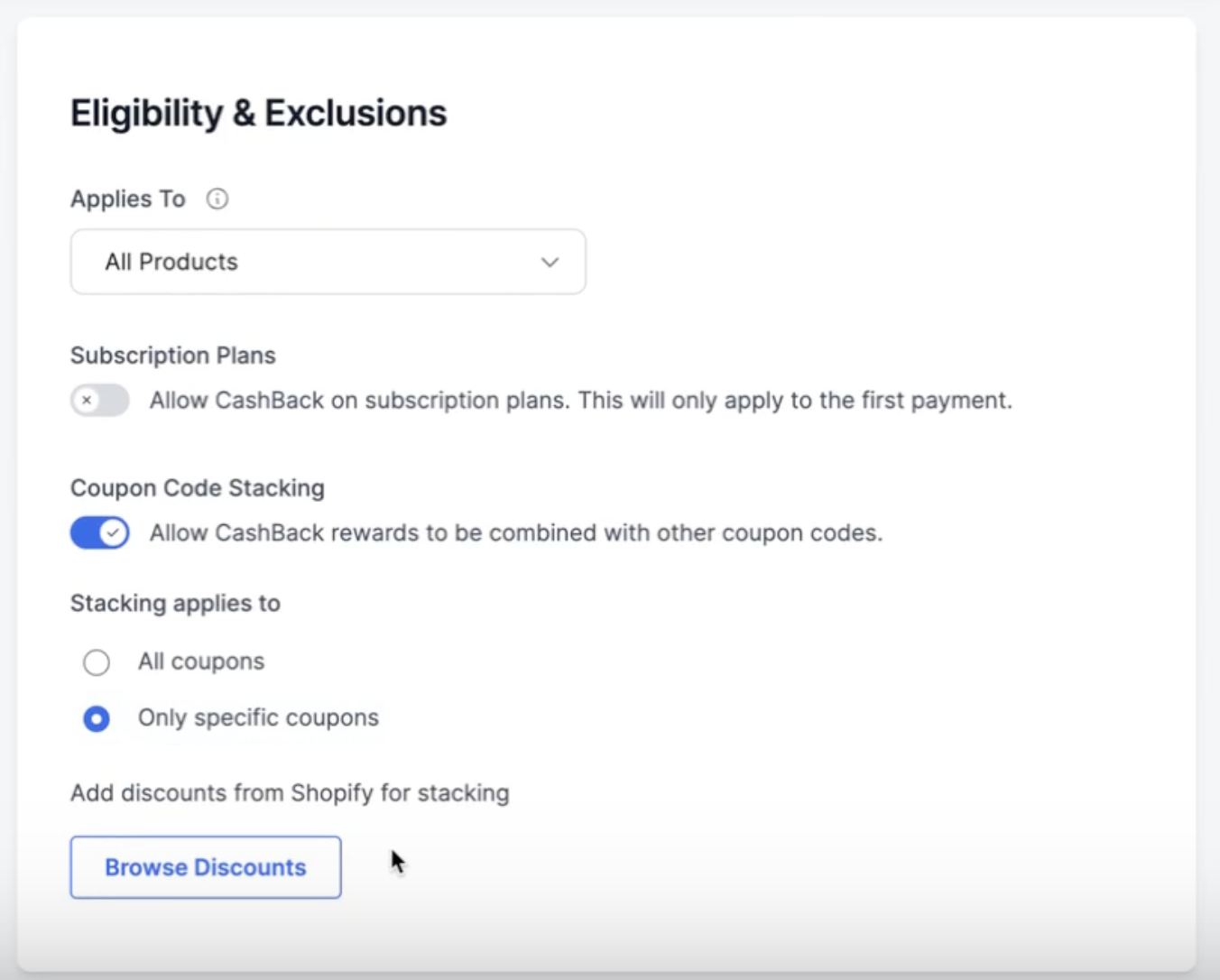 - Only specific coupons – You can select which Shopify static discount codes can stack with this CashBack promotion.
